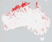 A second complex of fires also ignited north of Glenaladale on 16 January. By 18 January these fires were 3 km (1.9 mi) south-west of the Glenaladale community, however all were contained the following day.[26] The fire broke containment lines on 9 February, a day with recorded temperatures of up to 41.7 °C (107.1 °F) and an average daily wind speed of 44 km/h (27 mph) in the area.[26] During a 67-day period, the blaze burned 6,727 ha (16,620 acres) of forest within the Mitchell River National Park and on private property, as well as impacting the communities of Fernbank, Fingerboards, Glenaladale and Mount Ray; 3 houses and 7 non-residential structures were destroyed and 1,000 head of livestock died.[22][26]