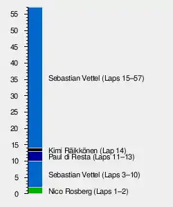 At the start, Nico Rosberg kept his lead into the first corner, with Vettel and Alonso keeping close company. On the second lap, Vettel went into the lead, and Alonso went into second place. Around the same time, Adrian Sutil, Jean-Éric Vergne and Giedo van der Garde were involved in a collision. Vergne eventually retired on lap 16, with damage caused by a puncture. Sutil would remain in 13th place, stuck behind Nico Hülkenberg for most of the race. Meanwhile, Fernando Alonso was complaining about his DRS system not working properly. It was in fact stuck open. He pitted to get the wing fixed. However, when trying to overtake, it got stuck open again, and was forced to remain without DRS for the rest of the race. He eventually finished 8th as a result. There was drama between the two McLarens of Jenson Button and Sergio Pérez. The two went onto the radio, and complained about each other battling aggressively for the past few laps. Button fell to 10th by the closing stages, while Pérez managed to get into 6th, only two seconds ahead of Webber and Alonso, and only 6 tenths behind Lewis Hamilton at the finish. Rosberg had fallen rapidly down the field, and would barely finish in the points, in 9th. Paul di Resta on the other hand, was more successful. He was running in third place at the finishing stages, before Romain Grosjean took the honours with just a few laps remaining. Grosjean's teammate Kimi Räikkönen managed to get into second place, and stay there until the end of the race. Vettel was challenged by him, but he held his own until the flag had fallen, taking his second victory of the season. Felipe Massa on the other hand, had a disappointing weekend. He qualified well in 4th place, but during the race, dropped to 15th place due to two tyre failures.