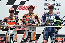 Dani Pedrosa, Marc Márquez and Jorge Lorenzo, celebrating on the podium after finishing second, first and third at the MotoGP race.