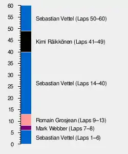 After the safety car period, Webber began to make his way through the field before becoming stuck behind the Sauber of Esteban Gutiérrez. He was unable to pass the Mexican for more than ten laps and pitted to try to get an advantage with fresh tyres and clean air. Meanwhile, the McLaren drivers were once again having a tussle, with Jenson Button getting past Sergio Pérez at turn one. Pastor Maldonado, driving in the 600th grand prix race for the Williams F1 Team, was in the points in eighth, along with his team-mate and rookie Valtteri Bottas in tenth. Räikkönen was leading on lap 41 after Vettel and Grosjean had pitted for the third time. Lotus waited until lap 49 to pit Räikkönen, switching him to the soft tyre, which left Vettel and Grosjean in first and second, with Alonso a threat from behind in fourth place. Grosjean was then told on the radio to not hold Räikkönen up, for championship title points reasons. It took a few laps for Räikkönen to pass Grosjean and afterwards he attempted to chase down Vettel. Alonso set the fastest lap of the race, almost a second faster than the first three drivers, and was rapidly catching Grosjean. Meanwhile, Hamilton made a move on his former team-mate Button at turn two, moving into fifth. Webber then made a move on Pérez to go into seventh.