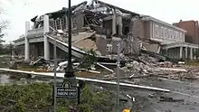 In Forrest County, roughly 300 homes and other structures were damaged/destroyed as the tornado moved through various neighborhoods and business districts. The University of Southern Mississippi sustained significant damage to the southern portion of its campus; at least six buildings were damaged and two others were destroyed there. Near the university, a gas station, a strip mall, a church, an apartment building, and multiple homes were damaged/destroyed, and some metal traffic light poles were mangled. The tornado continued through residential areas to the east of U.S. 49, where many trees were uprooted, homes were heavily damaged, and a church's steeple was blown off. Large metal light poles at the athletic fields of Hattiesburg High School were snapped, and the third base wall at the baseball field was destroyed. The gymnasium sustained considerable damage to its roof as well. Near the high school, the American Red Cross Building lost its roof and some of its exterior walls, and the Girl Scouts of Greater Mississippi building had its roof torn off as well.[1][4][11] The tornado then impacted the northern fringes of downtown Hattiesburg, damaging or destroying several more homes, snapping numerous power lines, and causing heavy damage to several large brick buildings, three of which were leveled. Damage intensity throughout the city of Hattiesburg ranged from EF2 to EF3. The tornado maintained its strength as it continued into Petal, where an ACE Hardware store was completely leveled and more homes were damaged or destroyed.[1][4][12]