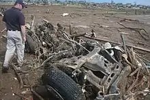 The tornado maintained EF3 intensity as it crossed the Canadian River into Cleveland County, and a decommissioned U.S. 62/U.S. 277 bridge was severely damaged; this bridge had to be demolished after the tornado ripped part of it from its mount and tossed it across Interstate 44.[24] The tornado then continued directly toward south Oklahoma City and Moore, roughly following Southwest 149th Street. At that point, it began to grow rapidly in width, and a second brief area of EF4 damage was noted near South May Avenue, where several homes were leveled, and one was swept clean from its foundation (this home was determined to have been nailed, rather than bolted to its foundation).[21] A vehicle frame, engine block, and various other vehicle parts were found tangled within a grove of completely debarked trees in this area.[19] As the tornado began to cross into south Oklahoma City, a traffic jam had occurred for a stretch of several miles along Santa Fe Avenue, as residents attempted to either escape from or pick up their children at schools located near the tornado's path. As the station's news helicopter was capturing live video of the tornado, then-KWTV chief meteorologist Gary England − upon seeing footage of the backup that was being relayed by pilot Jim Gardner − urged drivers caught in the jam that may have been listening to the station's audio simulcast on area radio outlets to use nearby streets to detour out of the tornado's expected track.[17] The tornado weakened briefly to an EF3 before re-intensifying to EF4 intensity near Forman Drive, flattening several homes as it moved through mostly rural areas south of Southwest 149th Street. As the tornado struck an oil production site, four oil tanks were blown away, one of which was never found. The others were thrown considerable distances; one was found a mile away.[20][21]