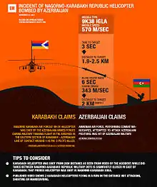 Analyst Thomas de Waal described the shootdown as "the worst military incident in more than 20 years since the cease-fire."[4] On the same day, footage appeared in the Azerbaijani media purporting to show the moment of the shootdown. Two Mi-24s are seen flying parallel to the line of contact, as the launch of a surface-to-air missile, identified as an Igla-S MANPAD, is heard off screen and one of the helicopters is struck and crashes to the ground.[5]