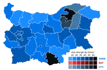 Parliamentary elections were held in Bulgaria on 5 October 2014 to elect the 43rd National Assembly.[1] GERB remained the largest party, winning 84 of the 240 seats with around a third of the vote. A total of eight parties won seats, the first time since the beginning of democratic elections in 1990 that more than seven parties entered parliament.[2] Boyko Borisov then became prime minister as head of a coalition with the Reformist Bloc and with outside support from the Patriotic Front and the Alternative for Bulgarian Revival.