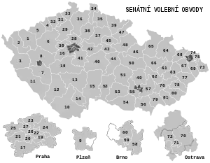 Map of senate constituencies of the Czech Republic. The 2014 election were held in the constituencies Nos. 3, 6, 9, 12, 15, 18, 21, 24, 27, 30, 33, 36, 39, 42, 45, 48, 51, 54, 57, 60, 63, 66, 69, 72, 75, 78 and 81[4]