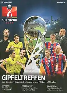 Dortmund were the reigning champions, having beaten Bayern 4–2 in 2013, although the season before, Bayern beat Dortmund 2–1. Both teams had won four previous installments (of seven attempts by Bayern and six by Dortmund), and thus the winners would set a new record.[2] The match took place on 13 August 2014 at Signal Iduna Park in Dortmund.[3]