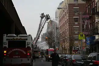 Two fire companies, quartered in an FDNY firehouse located approximately five blocks to the south, reported hearing and feeling the effects of the massive explosion and alerted the department's dispatch office. Within a short amount of time, the incident escalated to a five-alarm fire, bringing over 250 firefighters to the scene.[16]