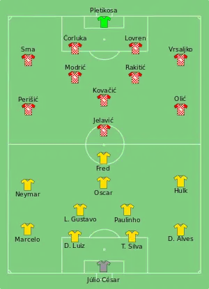 Croatia opened the scoring through a Marcelo own goal, as the ball bounced off him into the net after Nikica Jelavić deflected Ivica Olić's cross.[3] Neymar equalised for the hosts with a 25-yard (23 m) shot after receiving a pass from Oscar.[4] In the second half, Brazil took the lead with Neymar's penalty after Dejan Lovren was controversially judged to have fouled Fred in the penalty area.[4] Croatia had a potential equaliser disallowed, after a foul was again controversially called on the Brazilian goalkeeper, Júlio César.[5][6][7] In added time, Oscar sealed the win, toe-poking the third goal for Brazil from 22 yards (20 m) after receiving a pass from Ramires.[4]