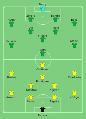 After a goalless first half, Colombia scored first when James Rodríguez headed in Juan Cuadrado's corner.[12] The lead was extended six minutes later when Ivory Coast was caught in possession, and Teófilo Gutiérrez released substitute Juan Quintero to score. Ivory Coast reduced the deficit through Gervinho, who received a pass from Arthur Boka in the left wing, dribbled past three Colombian players and shot home.[13]
