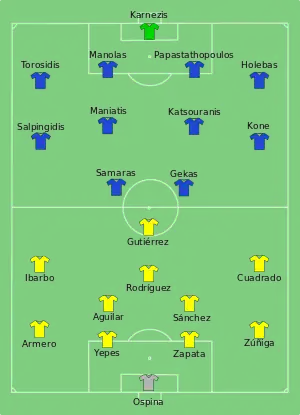 Colombia took the lead within five minutes, Juan Cuadrado's cutback was converted by Pablo Armero via a deflection off Greek defender Kostas Manolas. Colombia extended the lead in the second half, when Abel Aguilar flicked on a corner kick from James Rodríguez and Teófilo Gutiérrez scored from close range.[3] Greece's best chance fell to Theofanis Gekas, who headed against the bar. In stoppage time, Cuadrado set up James to complete the scoring with a low shot.[4]