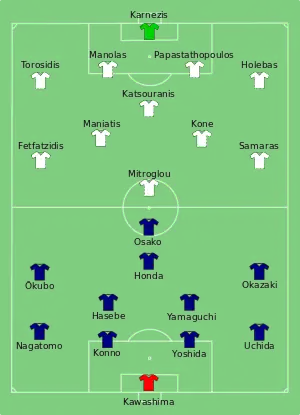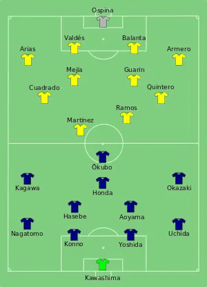 Greece was reduced to ten men in the first half when Kostas Katsouranis was booked twice in eleven minutes. In the second half, Greece had a Theofanis Gekas header saved, while Japan, which needed at least a point to stay alive in the competition, had chances to score through Yoshito Ōkubo and Atsuto Uchida, but the game finished goalless.[15] The result ensured Colombia's qualification to the knockout stage, their first since 1990.[16]