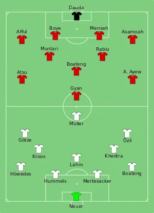 After a goalless first half, Germany took the lead when Thomas Müller crossed from the right for Mario Götze, whose header went in off his thigh. Ghana equalised three minutes later, when André Ayew headed in Harrison Afful's cross from the right. Ghana then took the lead when Sulley Muntari intercepted the ball from Philipp Lahm, then slipped a through ball for Asamoah Gyan to score with his right foot.[14] Just two minutes after coming on as a substitute, Miroslav Klose once again tied up the match, with a close-range finish after Benedikt Höwedes flicked on a corner from Toni Kroos.[15]