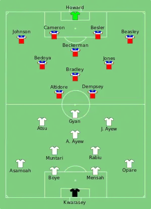 Clint Dempsey opened the scoring for the United States within 29 seconds (the fifth fastest goal in the history of the World Cup[7][8]), as he received the ball from Jermaine Jones, dribbled past John Boye and shot into the far corner. The lead lasted until the 82nd minute, when Asamoah Gyan's back-heel set up André Ayew to score. However, the United States scored the game-winning goal four minutes later, when half-time substitute John Brooks headed in Graham Zusi's corner.[9] The American victory was marred by an injury to Jozy Altidore, leaving the match in the 21st minute with a strained left hamstring.[10]