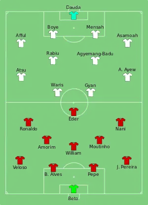 Both teams came into the match knowing that to have any chance of qualifying for the knockout stage, they had to win while hoping that the United States vs Germany match, played at the same time, did not end in a draw. Portugal took the lead in the first half, when John Boye deflected in Miguel Veloso's cross with his knee for an own goal. Asamoah Gyan equalised for Ghana in the second half, heading in Kwadwo Asamoah's outside of the foot cross from the left. Cristiano Ronaldo scored Portugal's game winner in the 80th minute, after Ghana goalkeeper Fatau Dauda palmed the ball to him in the penalty area after a cross from the left.[38] Despite the win and Germany's win over the United States, Portugal finished behind the United States on goal difference, and were eliminated together with Ghana, which failed to reach the knockout stage for the first time in their three campaigns.[39]