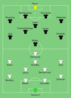 Both teams came into this match needing only one point to qualify for the knockout stage. The only goal of the match was scored by Thomas Müller in the 55th minute, who slotted in the rebound with his right foot from the edge of the penalty area after American goalkeeper Tim Howard parried out Per Mertesacker's header.[30] With the win, Germany qualified as group winners, while the United States also qualified despite the loss as Portugal's 2–1 win over Ghana at the same time ensured that the Americans finished as group runners-up above the Portuguese on goal difference,[31] meaning that they reached the knockout stage of consecutive World Cups for the first time.[32] This was the first match of the tournament where Bastian Schweinsteiger was included in the starting lineup and the last match where Lukas Podolski saw any time on the pitch.