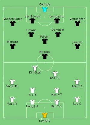 Belgium, who had already qualified for the knockout stage and would win the group if either South Korea did not win this match, or Algeria didn't beat Russia in the other simultaneous match, had Steven Defour sent off for a reckless tackle on Kim Shin-wook at the end of the first half. Belgium scored the only goal of the match in the second half, when substitute Divock Origi's shot was parried by South Korea goalkeeper Kim Seung-gyu and Jan Vertonghen converted the rebound with his left foot.[16]