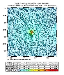 The 2014 Kangding earthquake struck Kangding County, Garzê Tibetan Autonomous Prefecture, Sichuan, China, with a moment magnitude of 5.9 on 22 November.[6] The earthquake killed five and injured 54 people.