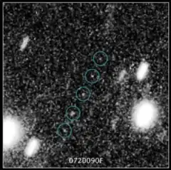 2014 MT69 was discovered by the New Horizons KBO Search with the help of the Hubble Space Telescope (HST)[8] because the object has a magnitude of 27.3, which is too faint to be observed by ground-based telescopes. Preliminary observations by the HST searching for KBO flyby targets for the New Horizons probe started in June 2014, and more intensive observations continued in July and August.[9][10] 2014 MT69 was first discovered in observations on June 24, 2014 during the preliminary observations, but it was designated 0720090F at the time,[2] nicknamed "7" for short.[3][4] Its existence as a potential target of the New Horizons probe was revealed by NASA in October 2014,[4] but the official name 2014 MT69 was not assigned by the Minor Planet Center (MPC) until March 2015 after better orbit information was available.[3] The parameters of the orbit have the extremely large uncertainty of 9 because follow-up observations after discovery eliminated 2014 MT69 as a potential target of the New Horizons probe, and no further follow-up observations were made.[4]