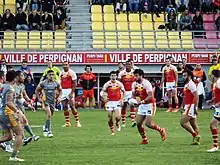 Salford Red Devils (grey) against Catalans Dragons in the Super League XIX