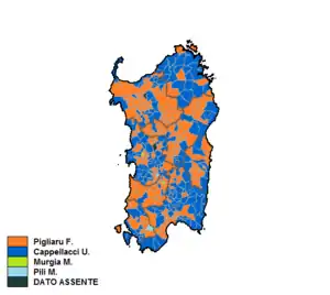 | Francesco Pigliaru | 312,982 | 42.45 | 1 | Democratic Party | 150,492 | 22.06 | 18 | ||
