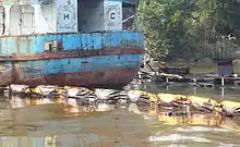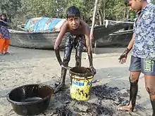 After the spill, primarily Bangladeshi fishermen began to clean up the oil using sponges and sacks.[8] Padma Oil Company, a government-owned corporation, bought the oil at a price of 30 takas per litre.[22] The Bangladeshi navy initially sent four ships to deal with the spill, and planned to use chemicals to disperse the oil,[8] but the plan was canceled, as there were concerns that dispersing the oil would further damage the ecology and biodiversity of the mangrove forest.[23] The government of Bangladesh closed the Shela River to all vessels.[24] The owner of the sunken oil tanker, MS Harun & Co., began salvage efforts, assisted by three private rescue vessels. The Bangladesh Forest Department filed a 1 billion taka lawsuit against the owners of the two cargo ships involved in the collision.[25] By 12 January 2015, the government, with the help of local residents, the Bangladesh Navy, and the owner of the oil tanker, had collected 70,000 litres (15,000 imp gal; 18,000 US gal) of oil.[10] The Bangladesh government said that they do not have the capacity to manage oil spills.[26][27]