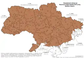 The voting was not provided in the annexed Autonomous Republic of Crimea and Sevastopol. The voting also did not reach significant parts of Donetsk and Luhansk oblasts because of the ongoing war in Donbas.[3] Because of this, 27 out of the 450 seats in the 8th Verkhovna Rada remained unfilled.