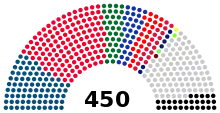 The Verkhovna Rada has 450 members, elected to a five-year term in parallel voting, with 225 members elected in single-member constituencies using FPTP system and 225 members elected by proportional representation (closed list) in a single nationwide constituency using the largest remainder method with 5% threshold.[17] Parties are not allowed to form electoral blocs (in contrast to 1998-2007 elections). Attempts to return to proportional representation with open party lists and electoral blocs were failed.[18]
