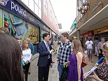 Ed Miliband talks to a local couple whilst campaigning in Crawley during the run up to elections - 23 May
