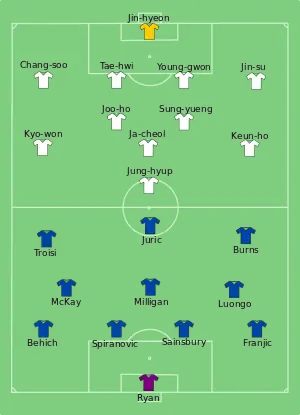 Burns was Australia's most likely source of a goal in the opening 45 minutes, and the majority of the 48,513 crowd inside a packed Brisbane Stadium thought the Wellington Phoenix striker had leveled the game four minutes after the Koreans had taken the lead, but the ball hit the side netting. Knowing a draw would ensure top spot in the group standings, the Australians pushed hard in the second half for the equaliser. Juric missed a gilt-edged chance eight minutes after the restart when he steered Franjic's return pass over the bar from six yards out while 11 minutes later substitute Mathew Leckie found the arms of Kim Jin-hyeon with his effort on the turn.[24]