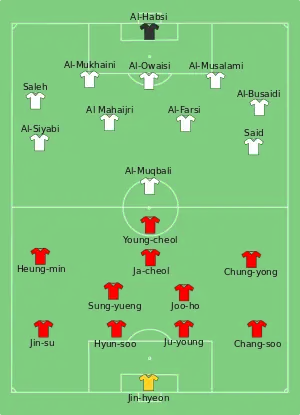 Lee Chung-yong pounced on a loose ball and laid the ball off to Koo and the midfielder's left footed shot from outside the area was beaten out by Al-Habsi only as far as a sliding Cho who forced the ball back across the wrong-footed goalkeeper and into the opposite corner from close range. South Korea continued as they had left off after the break and four minutes after the restart, Lee drove a low shot into the side netting and then Al-Habsi pulled off a fine reaction save to tip over Koo's header from point-blank range.