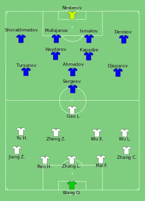 Uzbekistan took the lead into the break but failed to hold on, as China restored parity on 55 minutes. Forward Gao Lin set things up with a dazzling assist from the right by-line, flicking the ball into the path of Wu who atoned for his first-half deflection by firing home into the bottom left corner to make it 1–1. Alain Perrin's side then moved in front through Gao's 66th-minute substitute Sun. Just two minutes after coming on Sun beat Ignatiy Nesterov fair and square from the edge of the box, curling his shot beyond the outstretched arms of the Uzbekistan custodian to hand China the advantage.[16]