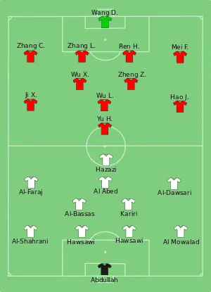 China nearly stung Saudi Arabia right away at the opposite end, Ren forcing a two-handed stop from Waleed Abdullah with a close-range header towards the bottom right corner of the net. The deadlock was finally broken after 80 minutes when Yu's free kick, from outside the box, took a wicked deflection off a defender to wrong-foot Abdullah who, despite a desperate attempt to keep the Yu's effort out, saw the ball skip into his net.[8][9]