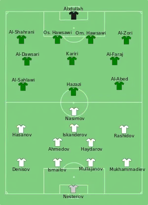 Uzbekistan remained on top as the half progressed against a shell-shocked Saudi Arabia who continued to struggle to settle into the contest with Cosmin Olăroiu's side, who showed one change from their win over North Korea last time out, only needing a draw to progress at the expense of their opponents. Saudi Arabia did enjoy a brighter end to the first half, although Uzbekistan goalkeeper Ignatiy Nesterov remained largely untested. The tight nature of the contest continued at the start of the second half, although despite Uzbekistan enjoying the greater share of possession, Saudi Arabia goalkeeper Abdullah was also enjoying a quiet evening following the early goal but the game suddenly swung Saudi Arabia's way on the hour mark as Al-Sahlawi confidently beat Nesterov from the penalty spot after Vitaliy Denisov had been adjudged to have bundled over Naif Hazazi inside the area as the pair challenged to meet Abdullah Al-Zori's left wing cross.[21]