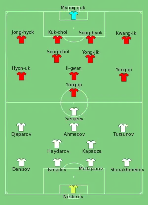 Odil Ahmedov had an early sight of goal when he tried his luck with a speculative long-range effort with just four minutes on the clock that went woefully wide before Timur Kapadze's deflected header came off the post. With the start of the second half came the torrential rain, which swept across the stadium to make conditions almost impossible. Uzbekistan almost claimed a second when Sanzhar Tursunov's free kick past his own goalkeeper with 10 minutes remaining while, with just three minutes left of the clock, Tursanov close-range effort was straight at Ri Myong-guk. The Uzbeks were almost made to pay for missing those opportunities with the last action of the game when Pak Kwang-ryong directed his powerful header towards goal, but Ignatiy Nesterov's reflex save was good enough to ensure Uzbekistan's held on for the win.[4]