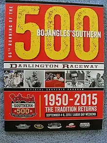 - "2015 Bojangles' Southern 500". Sprint Cup Series. Season 67. Darlington, South Carolina. August 22, 2015. Event occurs at 7:47 p.m. NBC Sports. NBC. Retrieved September 14, 2015.