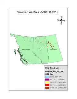 2015 Canadian wildfires were a series of wildfires across Canada and Alaska in July 2015 which spread smoke across most of North America. Over two hundred fires were ablaze across British Columbia, Saskatchewan, and Alberta.[1]