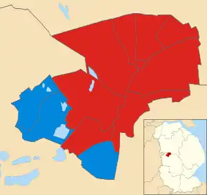 ![]() Map showing the results of the 2015 Lincoln City Council elections by ward. Red shows Labour seats and blue shows the Conservatives. | |||||||||||||||||||||||||