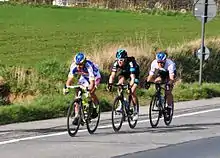 Over the next 70 kilometres (43 miles), the breakaway continued to build their lead over the peloton; with 100 kilometres (62 miles) to race, they had a lead of around six minutes, although Dal Col was dropped.[16] Shortly afterwards, the peloton climbed the Taaienberg, where Daniel Oss (BMC Racing Team), Matteo Trentin (Etixx–Quick-Step) and Matti Breschel (Tinkoff–Saxo) attacked and were soon joined by Tiesj Benoot (Lotto–Soudal). This breakaway was soon brought back by Team Katusha. Nairo Quintana was dropped during this period of racing and abandoned the race.[14] Tinkoff–Saxo, along with Team Sky, took up the chase in earnest and reduced the breakaway's lead to under two and a half minutes with 67 kilometres (42 miles) left. BMC Racing Team joined in the chase and halved the lead over the next 20 kilometres (12 miles). Van Ginneken was dropped, leaving three riders in the leading group.[16]