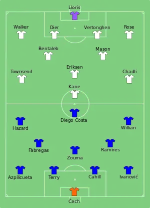 Neither side made a substitution at half time. In the 56th minute, Cesc Fàbregas – who had a bicycle kick saved by Lloris – set up Diego Costa, whose shot from the left of the area deflected off Tottenham right-back Kyle Walker and into the net to double Chelsea's advantage.[28] After conceding their second goal, Tottenham made a series of attacking substitutions – Andros Townsend, Ryan Mason and Chadli made way for Mousa Dembélé, Erik Lamela and Roberto Soldado respectively – but could not change the score. In the 74th minute, Dier's knee caught César Azpilicueta, drawing blood; the Chelsea left-back left the pitch to be bandaged and returned two minutes later. There were four minutes of added time, in which Chelsea substituted Costa for Didier Drogba.[29]