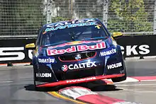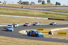 Jamie Whincup began his title defence in a strong manner, taking pole position for both of the Saturday races.[74] He went on to win the first race of the weekend ahead of Chaz Mostert and Fabian Coulthard. Scott McLaughlin, after qualifying third, failed to start the race after his car's oil pump failed on the warm-up lap.[75] Whincup dropped down the order in the second race due to a puncture, while Coulthard took victory with James Courtney and Craig Lowndes rounding out the podium. McLaughlin jumped the start and served the resulting ten-second penalty under safety car conditions, which led to another ten seconds being added to his race time, while Mostert hit the wall at turn eight and retired from the race. Michael Caruso also hit the wall at turn eight after contact with David Reynolds led to a puncture. Will Davison, after retiring from the first race, failed to start the second after a clutch failure on the warm-up lap.[76] Courtney won the final race of the weekend on Sunday ahead of Shane van Gisbergen and Garth Tander. Whincup and Mostert made contact on the last lap while battling for fourth, which led to Mostert hitting the wall and being collected by James Moffat. Both Mostert and Moffat failed to complete the lap. Marcos Ambrose, after struggling on Saturday, qualified inside the top ten on Sunday and finished twelfth. Courtney left the event with the championship lead ahead of Coulthard and Tander.[77]