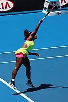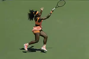Shortly after winning the first Grand Slam of the season, Williams, in an exclusive column for TIME magazine, announced her intention to end her 13-year boycott of Indian Wells and return to the tournament for the first since winning the title in 2001.[20] Her highly anticipated opening match was set for 13 March when Monica Niculescu advanced to the second round. Williams' return to Stadium 1 at the Indian Wells Tennis Garden was welcomed with rapturous applause and a standing ovation from those in attendance, including tournament owner Larry Ellison, co-founder of Microsoft Bill Gates and tennis legend John McEnroe.[21] Despite the warm reception Williams was tense and was broken immediately by Niculescu, who went on to serve for the opening set in the tenth game, but Williams' resilience saw her win three consecutive games to take the set. In the second set, the pair traded breaks early on and, just as in the first set, the American got the decisive break in the twelfth game to win the match.[22] In the third round Williams made quick work of an error-strewn Zarina Diyas, losing only two games, concluding with a second set bagel.[23] In the round of 16, Williams faced compatriot Sloane Stephens. A sharp and engaged Stephens got an early lead, taking the first three games, but Williams responded by winning the next three to level the match. The set remained on serve with Stephens saving a set point in the tenth game to force it to a tiebreak, which the younger American won. Williams fought back breaking Stephens' serve a collective four times over the final two sets to advance to the final eight.[24] At the quarterfinal stage Williams took on an in-form Timea Bacsinszky whom advanced to the final eight off the back of winning back-to-back titles in Mexico. The Swiss led the opening set in its early stages; however, as in her opening match, Serena came from behind and claimed the first set, with the decisive break coming in the twelfth game. The second set started with four consecutive breaks of serve. Williams righted the ship with a break of serve in the eighth game, which she backed up by serving out the match to 15 to secure a spot in the semifinals. Williams finished the match with 23 winners to her opponents' 11, including 7 aces.[25] Williams was set to face world No. 3 Simona Halep at the semifinal stage but had to withdraw before the match due to a right knee injury.[26] After her withdrawal was announced to those in attendance Williams came out on to Stadium 1 court to address the crowd, apologize for her withdrawal and reassure fans that she would be back in 2016.[27]