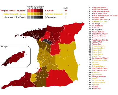 Preliminary results on election night indicated that the PNM had won a majority government with 22 of 41 seats, but with a majority of the popular vote flowing to the ruling People's Partnership coalition. On the final count however the PNM clearly secured an absolute majority of votes cast and obtained an extra seat from the PP, winning 23 of the 41 seats. The four parties in the PP alliance received a combined 46.6% of the vote, winning the remaining eighteen seats.[2]