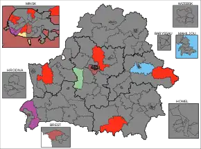 In contrast to the previous elections in 2012, the opposition did not boycott the elections, instead forming an alliance under the name Prava Vybaru (Belarusian: Права Выбару, Russian: Право выбора, 'The Right to Choose') consisting of the BPF Party, the Belarusian Christian Democracy, the Belarusian Social Democratic Party (Assembly), the Za svabodu movement, the United Civic Party of Belarus, the Belarusian Party "The Greens", the Belarusian Liberal Party of Freedom and Progress and the Trade Union of Electric Industry.[4] The Belarusian Left Party "A Just World" also contested the elections.[5]