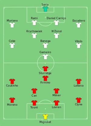In the 35th minute Daniel Sturridge scored with a shot using the outside of his left foot from out on the left after a pass from Philippe Coutinho. Seventeen seconds into the second half Kevin Gameiro made it 1–1 when he scored three yards out after a cross from the right by Mariano who got past Alberto Moreno by putting the ball between his legs.[34] Sevilla missed two more chances to score before they went in front in the 64th minute when Coke scored with a low right foot shot to the corner of the net from twenty yards. Coke got his second in the 70th minute with a right foot shot from six yards out on the right after the ball broke to him via a deflection off a Liverpool player.[35]