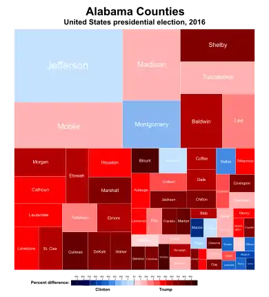 Alabama has voted for the Republican candidate in every election since it was won by Ronald Reagan in 1980. As such, Trump was heavily favored to win the state. On the day of the election, Trump won the election in Alabama with 62.08% of the vote, while Clinton received 34.36% of the vote.[3] The state had given 60.55% of its votes to Republican nominee Mitt Romney in 2012, meaning that it had shifted 1.53% more Republican from the previous election. Trump's margin of victory in Alabama was 27.72%, a 5.53% increase from Romney's 22.19% margin of victory.