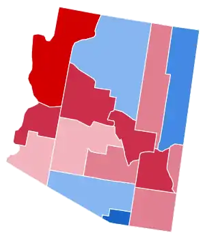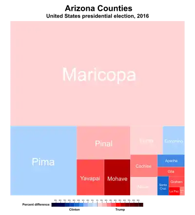 Notably, Maricopa County, the state's most populous county, went more Democratic than the state as a whole. The county had not voted for a Democrat since Harry S. Truman in 1948. Therefore, Trump's narrow win in the county suggested the Republican Party was losing ground in the state. In fact, the county and the state would go on to vote Democratic in 2020. Despite the rest of the country swinging to the right, Arizona decreased its margin of victory from 9.0% in 2012[2] to only 3.5% in 2016.
