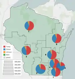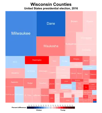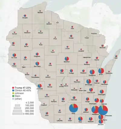 In the general election, Donald Trump unexpectedly won Wisconsin by a narrow margin of 0.77%, with 47.22% of the total votes over the 46.45% of Hillary Clinton. Wisconsin was the tipping-point state of the 2016 election; that is, the closest state that both candidates needed to win in order to emerge with a victory in the election (for example, Michigan, while closer, was not necessary for a Trump victory).[2]