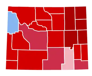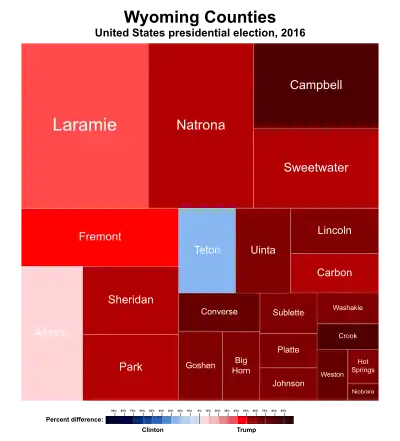 Donald Trump won the election in Wyoming with 67.4% of the vote. Hillary Clinton received 21.6% of the vote. Gary Johnson of the Libertarian Party received 5.1%.[2] Wyoming, a solidly Republican state, has not voted for a Democrat in a presidential election since it went for Lyndon B. Johnson in 1964. Trump carried every county with the exception of Teton County. His 45.8-point margin over Clinton in the state not only made it the most Republican in the 2016 presidential election,[3] but it is also the largest margin of victory by any presidential candidate in the state's history, besting Ronald Reagan's 42.3-point margin in 1984.