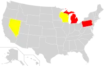 In accordance with the Electoral Count Act, all states must certify and submit their final election results to the electoral college six days before the college meets. Under this "safe harbor" provision, any recount efforts for the 2016 election had to be completed before the deadline of December 13, 2016.[9] The recount in Nevada went forward and were completed on schedule, resulting in only minor changes to vote tallies. Wisconsin permitted individual counties to decide whether to provide paper ballots for recount or merely to rerun the same computer totals.[10][11] A recount in Michigan was allowed to proceed for three days before being halted by court order,[12] and a federal lawsuit to compel a recount in Pennsylvania was dismissed.[13] While the partial Michigan recount did unearth some instances of improper ballot handling and possible voter fraud,[14] no indications of widespread hacking were discovered, and the overall outcome of the election remained unchanged, despite the evidence that the voting machines were old and faulty, possibly counting as "blank" ballots many that contained visually clear indications of presidential choice.[15][16][10][11]