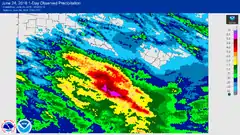On June 23, 2016, thunderstorms brought torrential rain to much of West Virginia, resulting in accumulations of up to 10 in (250 mm) in 12–24 hours. According to meteorologists at the National Weather Service, this rainfall qualifies as a 1,000 year event for parts of Kanawha, Fayette, Nicholas, Summers and Greenbrier counties. Rainfall totals included 9.37 in (238 mm) in Maxwelton and 7.53 in (191 mm) in Rainelle.[5] Two-day accumulations in White Sulphur Springs reached 9.17 in (233 mm).[6] In addition to the torrential rain, the storms produced an EF1 tornado near Kenna in Jackson County. The brief tornado lifted and rolled a single-wide trailer, injuring its two occupants; minor damage occurred elsewhere along its path.[7]